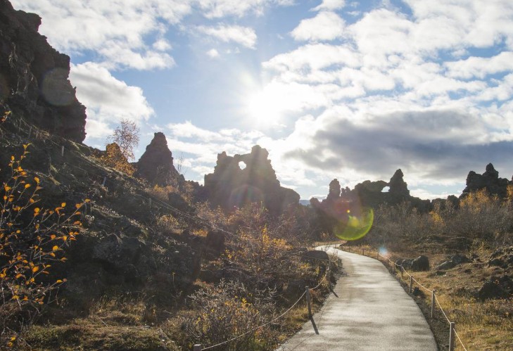 On this day, we concentrate on the beautiful area around Lake Mývatn. Lake Mývatn is a shallow lake in an area of active volcanism and boasts a high amount of biological activity. Starting from Akureyri, the drive to Mývatn takes about an hour and a half. Along the way, we stop at Goðafoss, the "Waterfall of the Gods," a stunning cascade with historical significance.